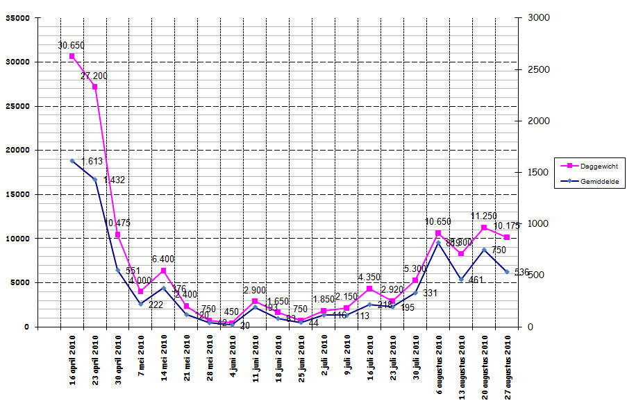 Totaal gewicht en gemiddelde gewicht per visdag