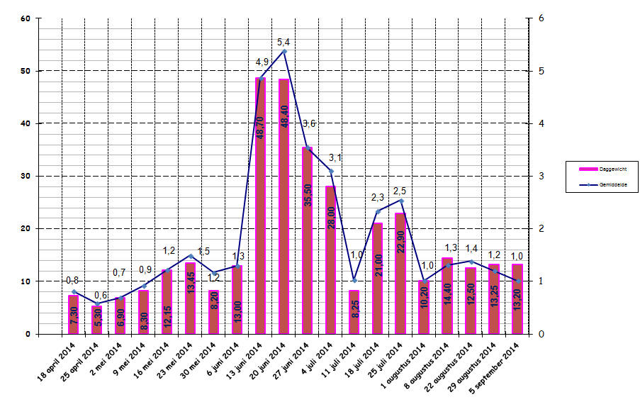 | Totale vangst (kg) | 351 | 318 | 430 | 237 | 145 | 638 | 772 | 576 | 776 | 365 | 334 |